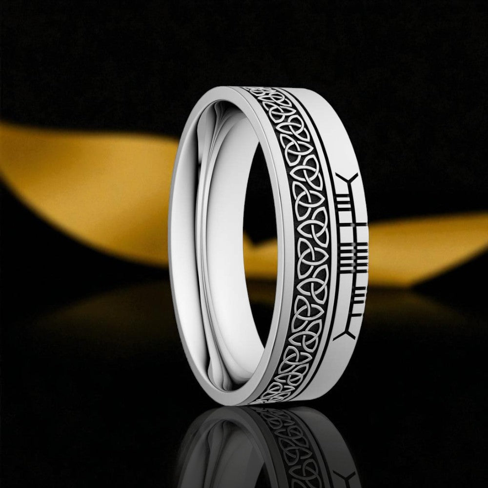 The Trinity Version of our Faith Collection Wedding Bands, customizable Ogham text to suit your special message . These high quality stunning Celtic rings are inscribed with the ancient Ogham script, the Celtic Alphabet, with the word FAITH.
