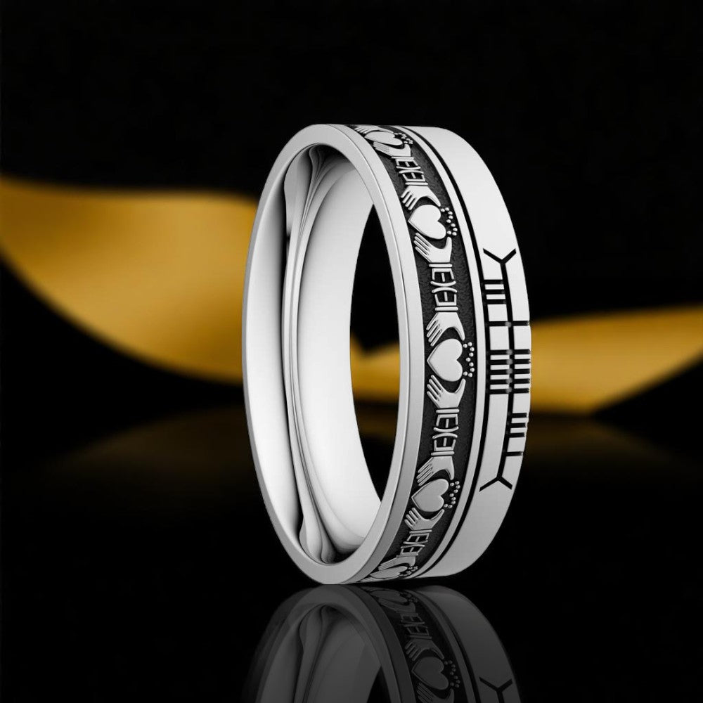 Comfort Fit Claddagh Band with Oxidised FinishThe Claddagh Version of our Faith Collection Wedding Bands, customizable Ogham text to suit your special message .