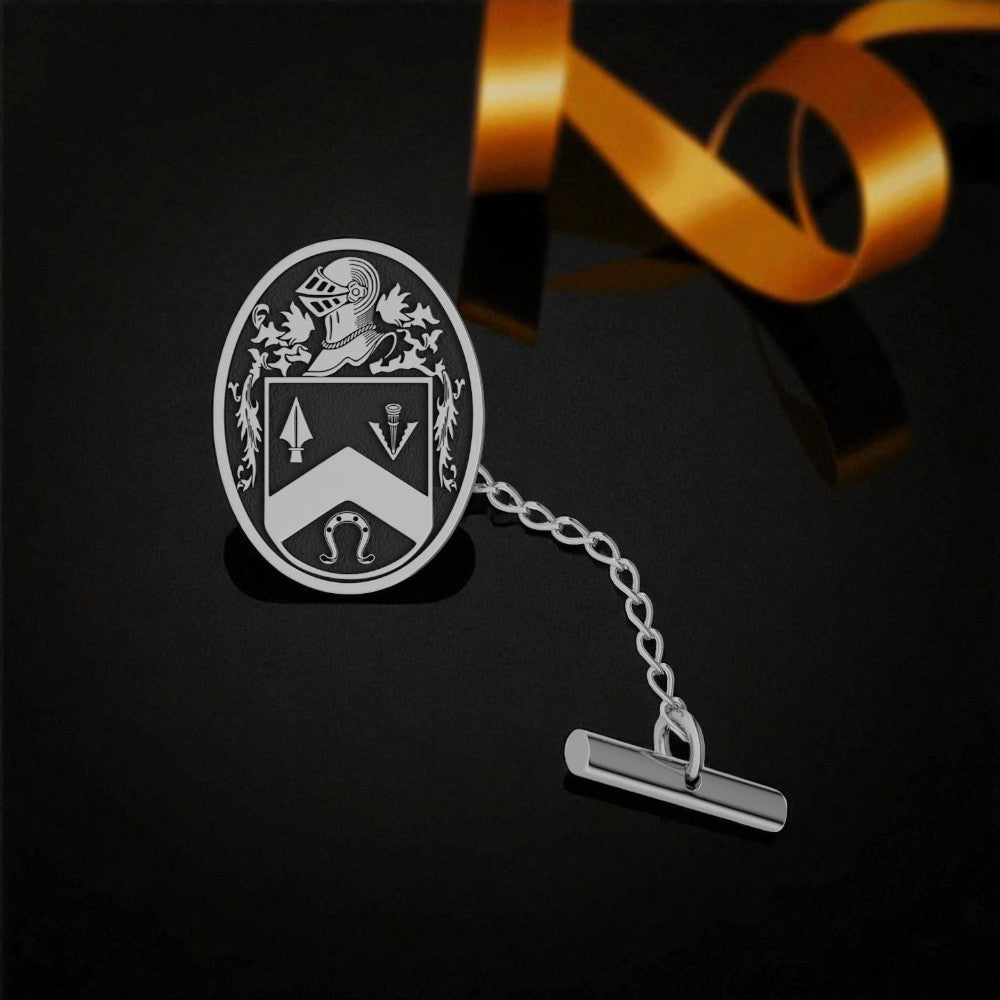 This Large Coat of Arms Tie Tac is an oval shaped unique Heraldry Tie Tac. The main shield is left free for your family coat of arms, college emblem or family motto making this a unique piece of jewelry to own and give. It comes complete with pin guard clutch back and chain. A great keepsake gift for men of any age!
