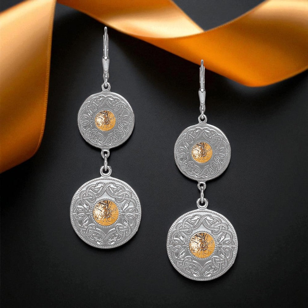 Celtic Warrior Double Disc Drop Earrings with 18K Gold Beads