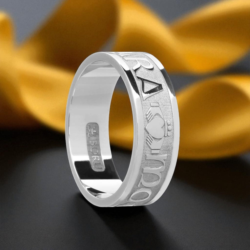 The ring has the words “Mo Anam Cara” in Gaelic script on the band punctuated by the Claddagh symbol. The ring consists of the Gaelic Script with the Claddagh symbol between each word.