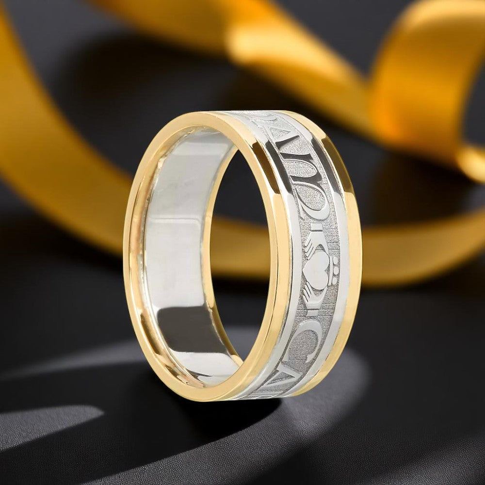 The ring is has the words “anam Cara” in Gaelic script on the band punctuated by the Claddagh symbol. The ring consists of the Gaelic Script with the Claddagh symbol between each word.