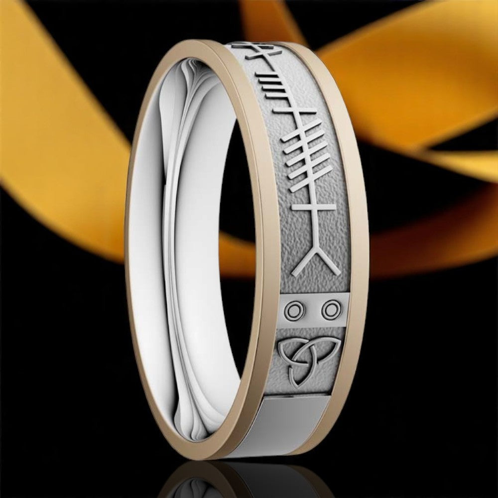 The Ogham Mo Anam Cara “My Soul Mate/Friend” Wedding Band in two tone metal with Trinity Knots on either end.